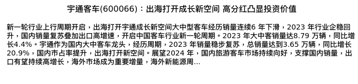 值得注意的是:2024年04月长江证券的高伊楠/张扬/陈佳分析师,首次发布关于宇通客车的研究报告,标题为:宇通客车(600066):出海打开成长新空间 高分红凸显投资价值。
