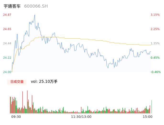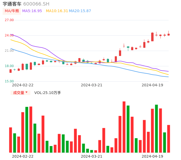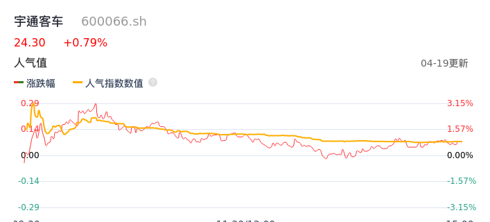 04月19日,宇通客车收报24.30,股价涨幅0.79%,成交金额6.12亿元,换手率1.13%。