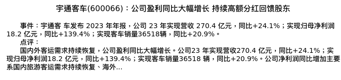 值得注意的是:2024年04月信达证券的分析师,首次发布关于宇通客车的研究报告,标题为:宇通客车(600066):公司盈利同比大幅增长 持续高额分红回馈股东。
