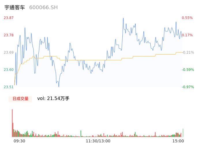 04月23日,宇通客车收报23.76,股价涨幅0.08%,成交金额5.10亿元,换手率0.97%。