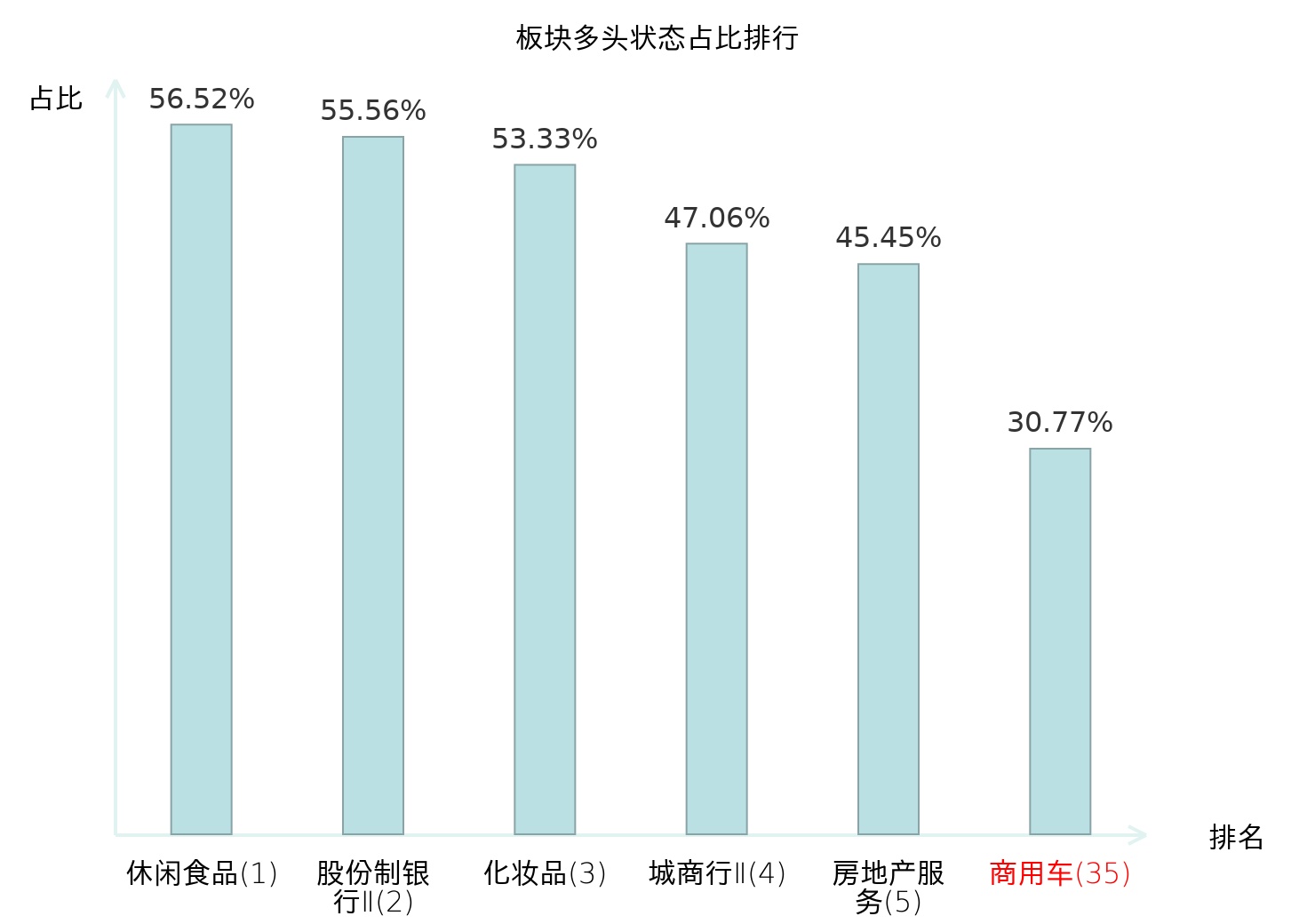 全市场所有行业板块中主力多头状态占比排名中,休闲食品板块位居第一。汽车服务板块名次提升最快,较昨日上升90位。