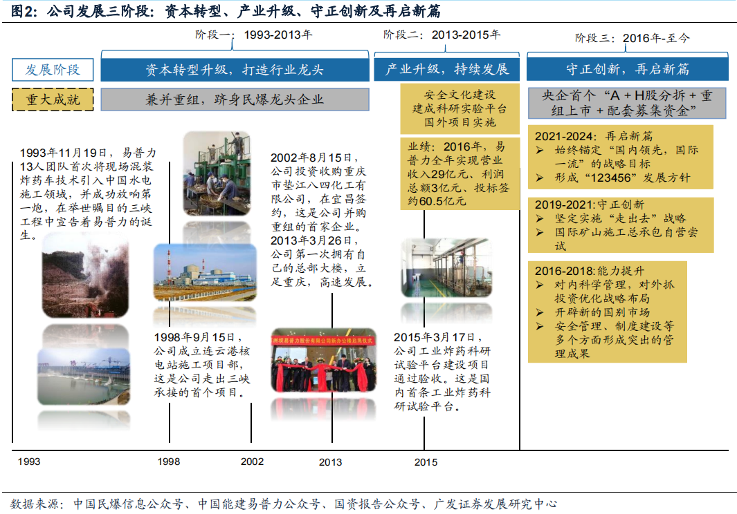 2023年通过“A/H股分拆+借壳南岭民爆+配套募资”完成重组上市,成为央企首例民爆业务独立上市平台;随着十余次收并购/投资控股顺利完成,公司成功完成企业业务跨越式发展。2025年3月,公司收购松光民爆,扩充产能指标6万吨。