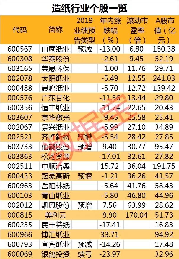对于2020年的业绩,从机构给出的一致盈利预期看,博汇纸业净利润将有大幅度增长,晨鸣纸业、山鹰纸业、太阳纸业等公司净利润将保持增长。