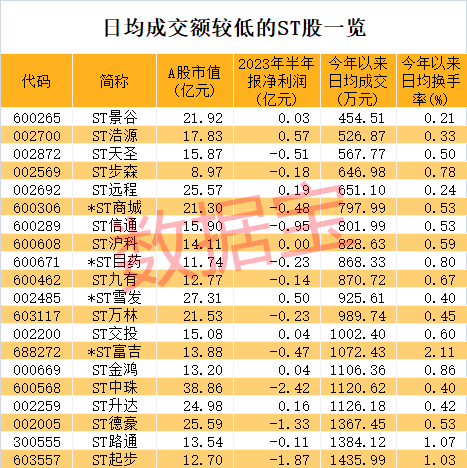 成交低迷、业绩不佳是ST股的两大普遍现象。数据宝统计,今年以来,ST股日均成交均值为0.51亿元,不到同期A股水平的三成;日均换手率均值为1.87%,仅为同期A股水平的六成。12只ST股日均成交不足千万元,包括ST景谷ST浩源ST天圣ST步森ST远程等。ST景谷日均成交额最低,仅454.5万元。