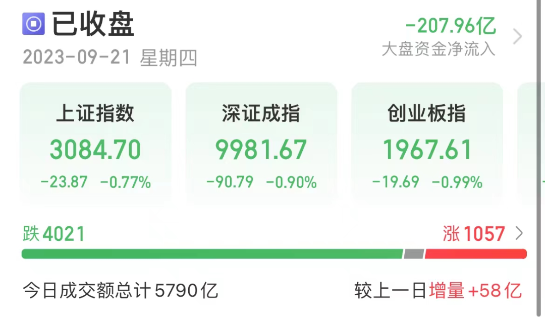 9月21日,上证指数下跌0.77%,最新指数跌破3100点整数关口;深证成指创业板指分别下跌0.9%、0.99%。A股全天成交近5800亿元,连续2日成交额低于6000亿元。盘面上,超过4000股飘绿,水产品、种业、减肥药、猪肉、一体压铸等题材跌幅居前。