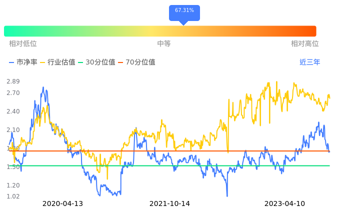 浙江富润当前市净率PB为1.74,在所属的综合中,市净率PB排11,前五名分别为亚泰集团市净率0.61、宁波联合市净率0.71、交运股份市净率0.76、悦达投资市净率0.86、*ST大通市净率0.93。浙江富润当前市净率PB为1.77,超过近3年67.31%的历史数据。