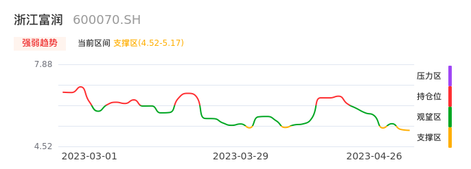 我们来看一下该股的九方特色指标强弱趋势的情况:浙江富润近日从观望区进入支撑区。股价出现一波快速下跌行情,目前下跌动能仍未衰竭。建议继续谨慎观望。注意今日下方支撑位:4.52元,如有效跌破将可能出现新一轮下跌