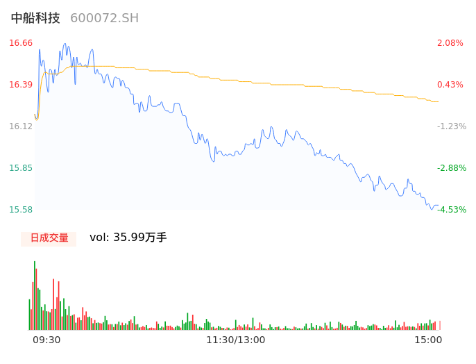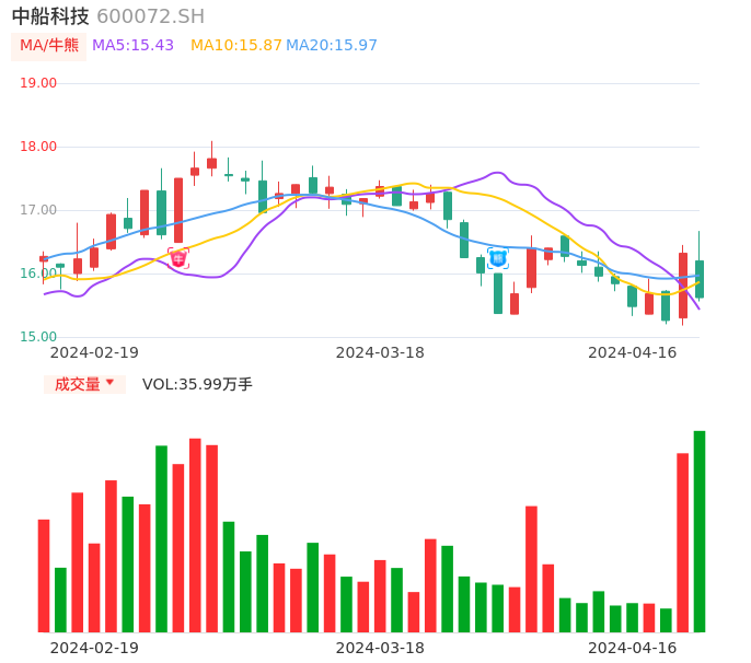 04月16日,中船科技收报15.62,股价涨幅-4.29%,成交金额5.86亿元,换手率4.89%。