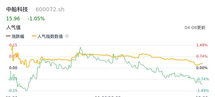 04月08日,中船科技收报15.96,股价涨幅-1.05%,成交金额1.82亿元,换手率1.54%。