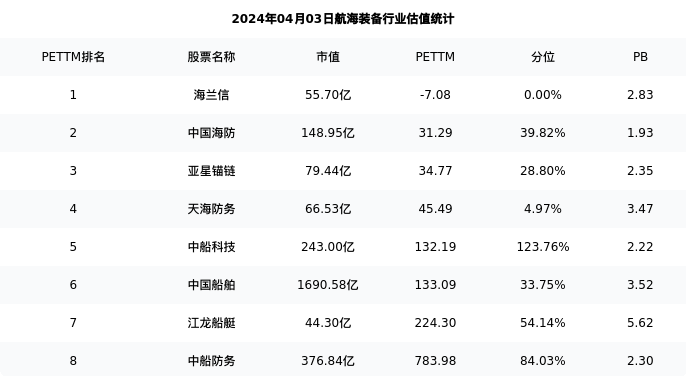 从估值角度看:中船科技最新市盈率PETTM为132.19,在行业内排名4/11,处于123.76分位。
