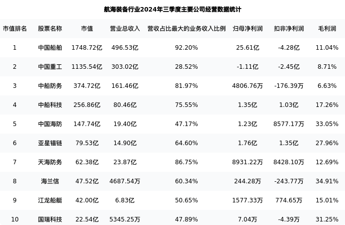 中船科技最新报告期数据为三季度,下表汇总了航海装备行业内市值靠前的公司三季度主要经营数据