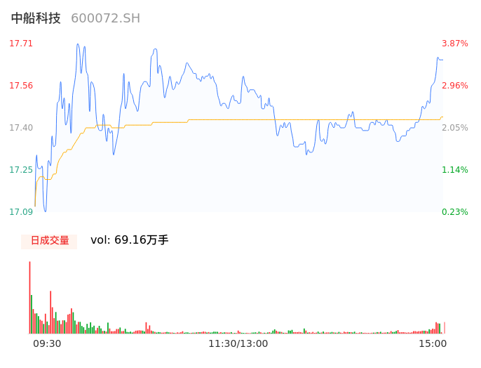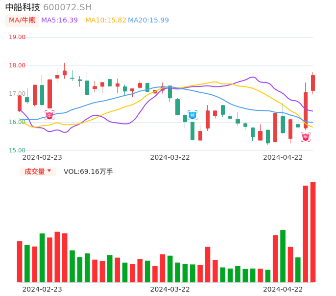 04月22日,中船科技收报17.65,股价涨幅3.52%,成交金额12.06亿元,换手率9.39%。
