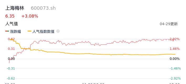 04月29日,上海梅林收报6.35,股价涨幅3.08%,成交金额8091.04万元,换手率1.37%。