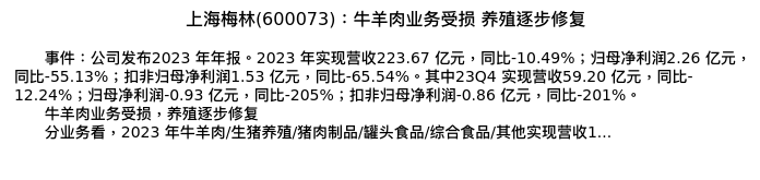 值得注意的是:2024年03月国投证券的赵国防分析师,首次发布关于上海梅林的研究报告,标题为:上海梅林(600073):牛羊肉业务受损 养殖逐步修复。