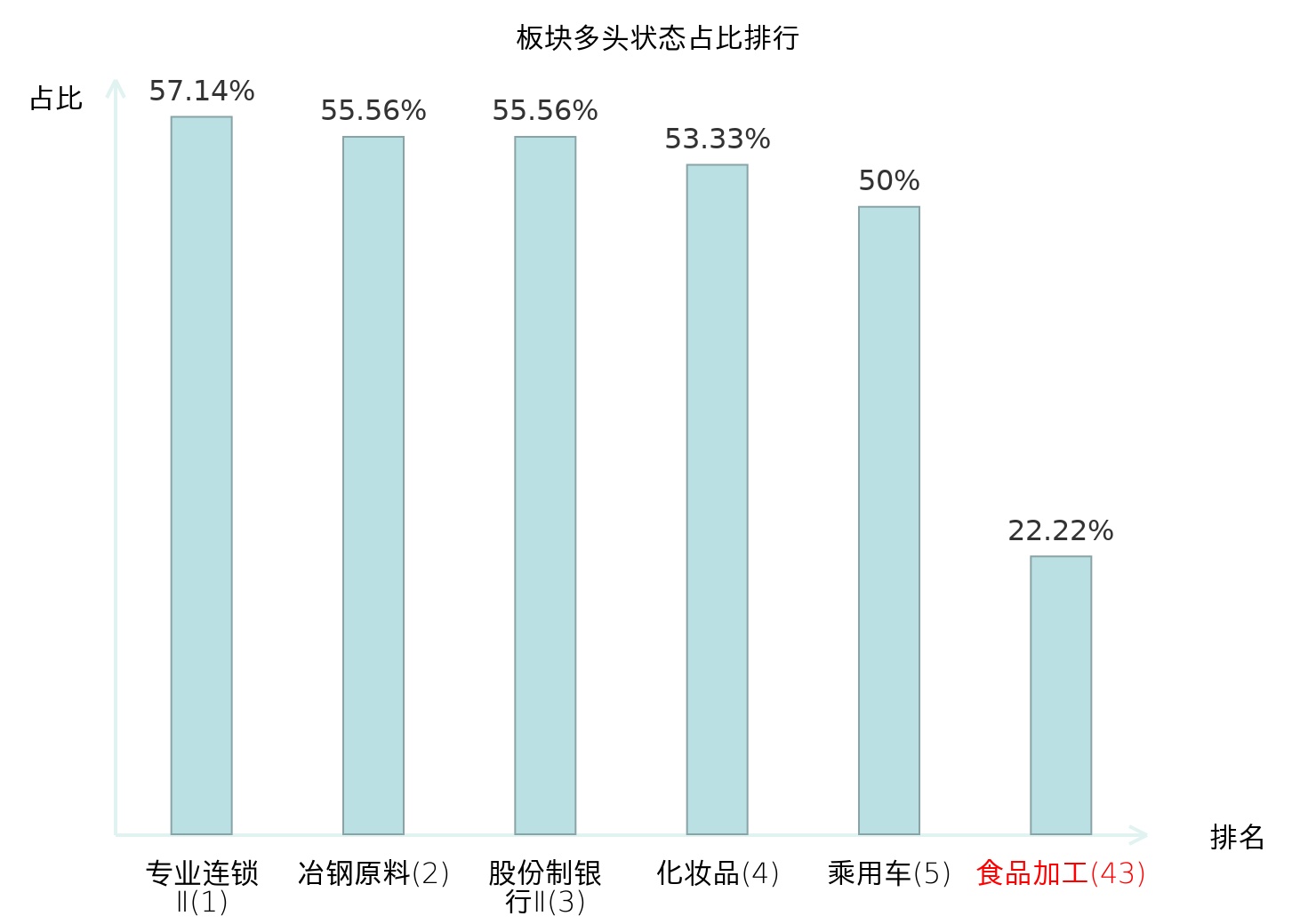 全市场所有行业板块中主力多头状态占比排名中,专业连锁Ⅱ板块位居第一。房地产服务板块名次提升最快,较昨日上升52位。