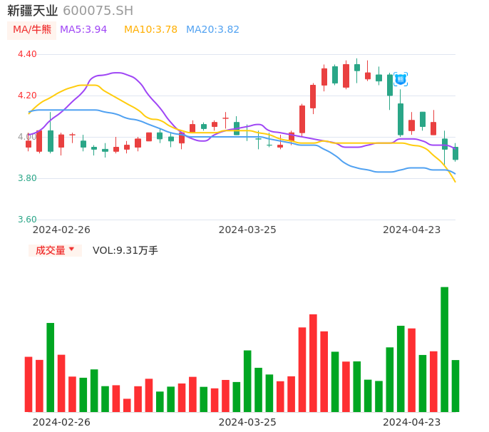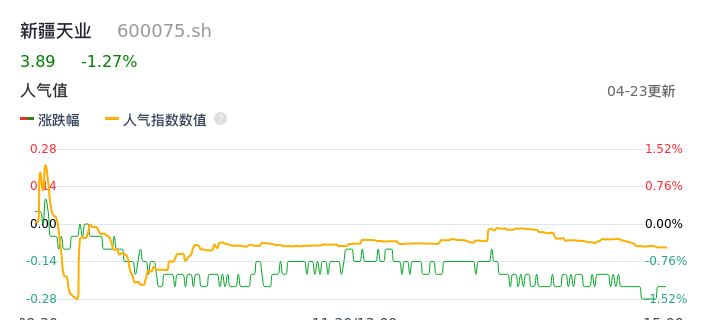 04月23日,新疆天业收报3.89,股价涨幅-1.27%,成交金额3637.94万元,换手率0.55%。