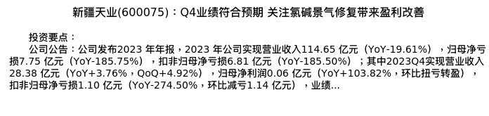 值得注意的是:2024年03月上海申银万国证券研究所的任杰/宋涛分析师,首次发布关于新疆天业的研究报告,标题为:新疆天业(600075):Q4业绩符合预期 关注氯碱景气修复带来盈利改善。