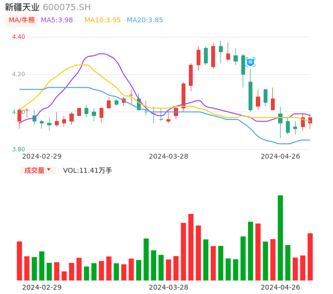 04月26日,新疆天业收报3.97,股价涨幅0.00%,成交金额4499.36万元,换手率0.67%。