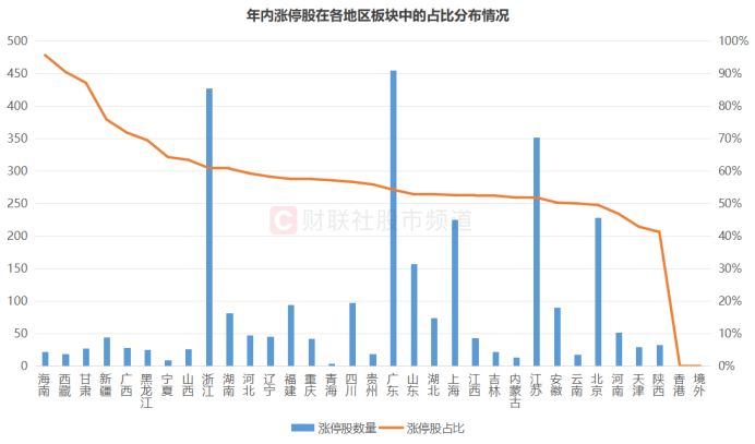 若按年内涨停股在各自地区板块内占比情况排名,不计算未有涨停股的省份地区,海南、西藏、甘肃、新疆、广西位列前五,其中,海南、西藏板块中年内涨停股的比例双双超9成。同时,黑龙江、宁夏、山西、浙江、湖南板块该占比也相对居前,而陕西、天津、河南、北京、云南等板块的比例相对靠后,其中,陕西、天津、河南、北京板块涨停股占比均未过半。