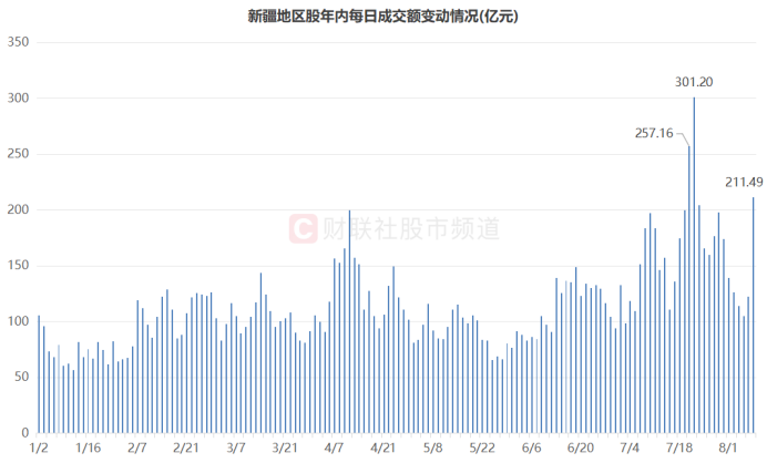 注:新疆地区股年内每日成交额变动情况(截至8月8日收盘)