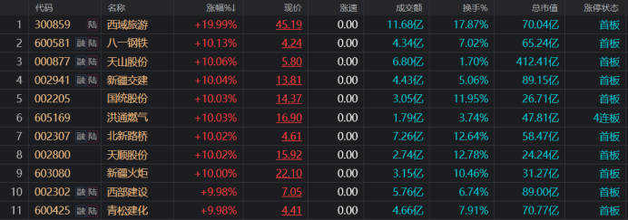 今日(8月8日),新疆地区股大爆发,截至收盘,累计共有11股录得涨停行情,占今日整个涨停股(不计算ST股)近2成比例。其中,洪通燃气成功晋级4连板,为目前除国机精工(5连板)外的最高连板股标的。此外,*ST天山、熙菱信息、新疆天业等股也涨幅居前。