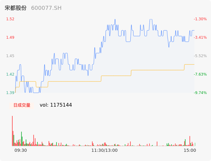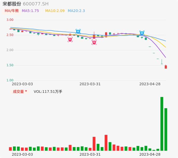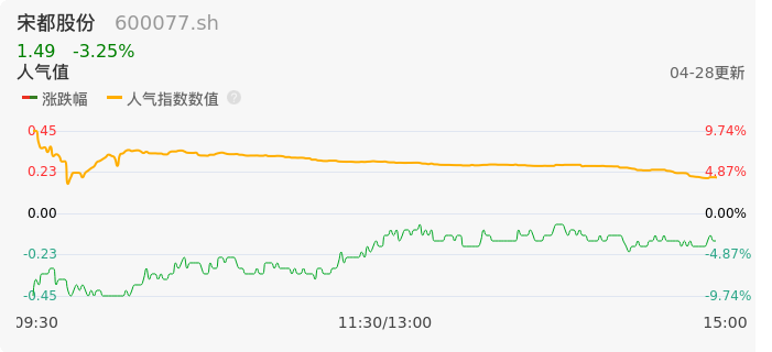 04月28日,宋都股份收报1.49,股价涨幅-3.25%,成交金额1.69亿元,换手率8.77%。