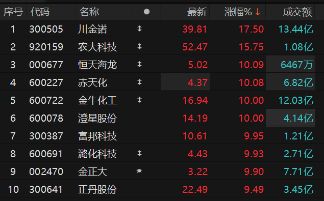 上证报中国证券网讯 3月13日,化工股表现强势,截至9时40分,潞化科技2连板,恒天海龙、赤天化、金牛化工、澄星股份等多股涨停。