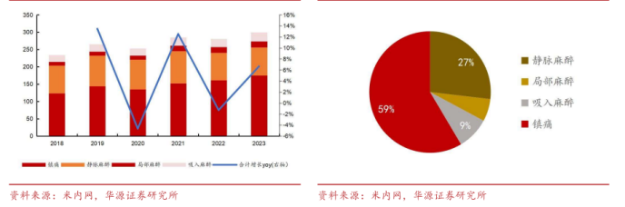 图表4:2018-2023年样本医院麻醉药销售情况(亿元分大类)(左)2023年样本医院麻醉药市场格局情况(大类)(右)