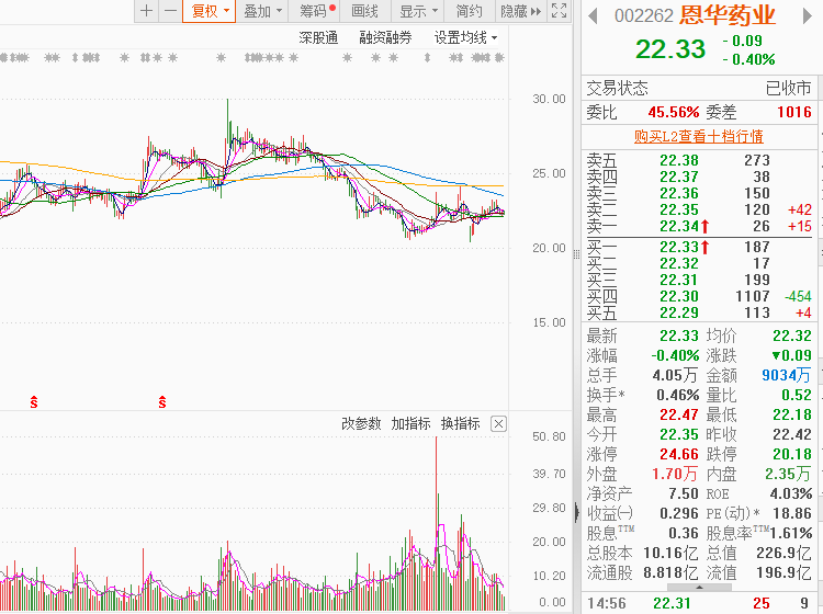 该股当下股价和估值处于上市以来的中位值偏下,经营业绩稳健增长,显然价值被低估;自去年10月份调整以来半年多时间,当下企稳震荡,中短期乃至长期都有很好的参与价值;该股市值仅200多亿,但有多家基金和外资持股;不管是业绩估值,市值大小还是概念属性,都是游资和主力喜爱的品种,具备炒作效应,近2个月股性活跃,一直在强支撑平台22元附近活跃震荡,各周期的均线都在向上靠拢,且温和放量,大概率触发反弹修复行情。