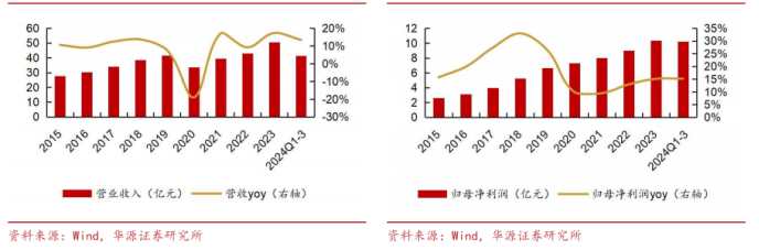 图表2:2015-2024Q1-3公司营收及增速情况(左)2015-2024Q1-3公司归母净利润及增速情况(右)