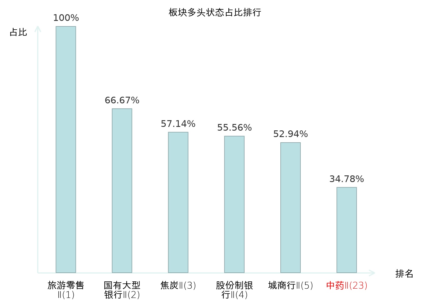 全市场所有行业板块中主力多头状态占比排名中,旅游零售Ⅱ板块位居第一。其他家电Ⅱ板块名次提升最快,较昨日上升101位。