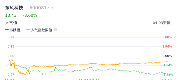 04月03日,东风科技收报10.43,股价涨幅-3.60%,成交金额6963.69万元,换手率1.49%。