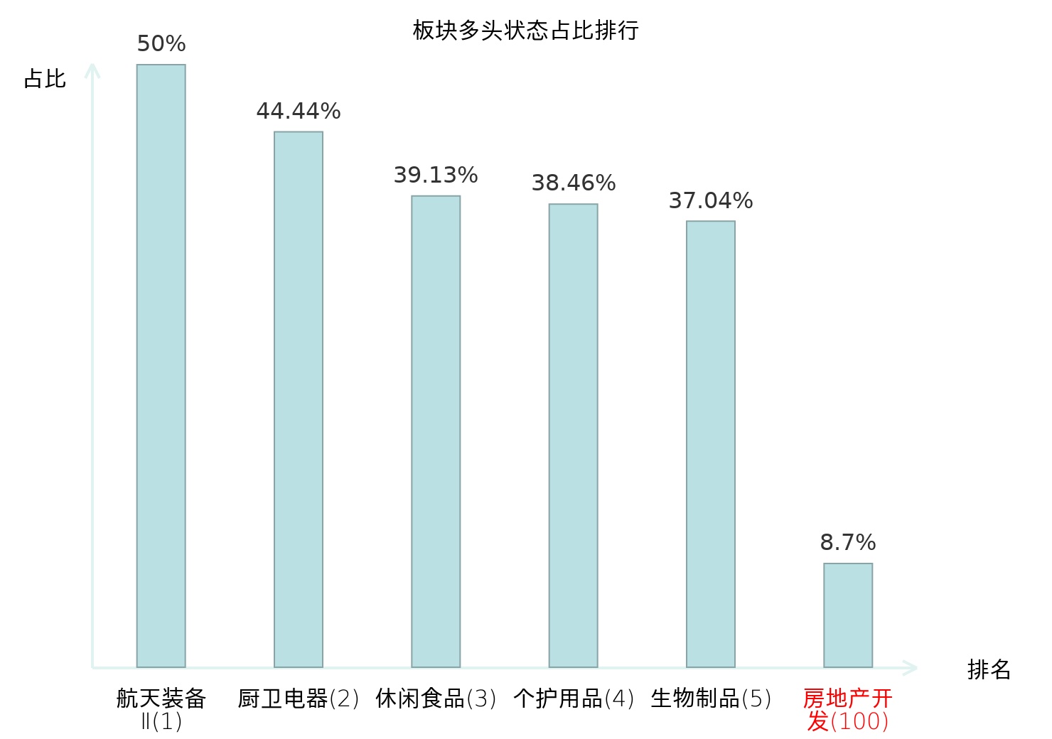 全市场所有行业板块中主力多头状态占比排名中,航天装备Ⅱ板块位居第一。小金属板块名次提升最快,较昨日上升53位。