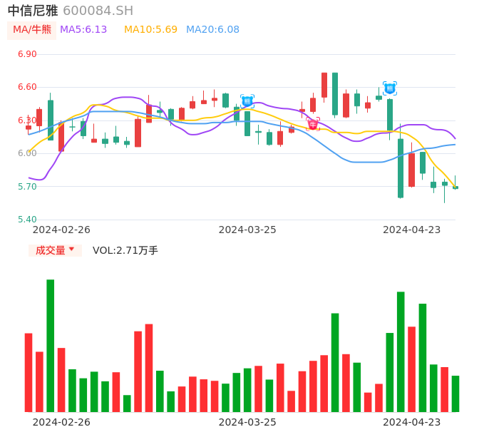 04月23日,中信尼雅收报5.68,股价涨幅-0.53%,成交金额1556.21万元,换手率0.24%。