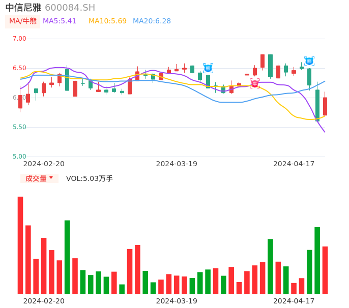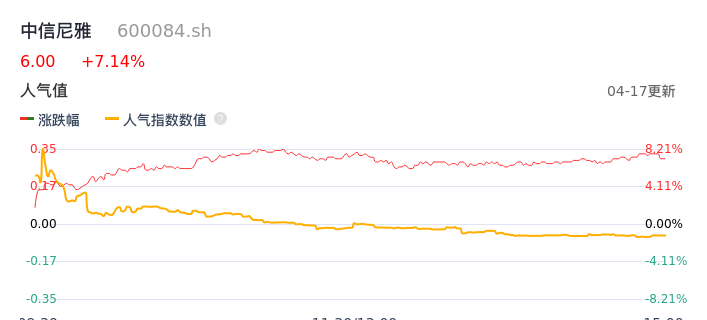 04月17日,中信尼雅收报6.00,股价涨幅7.14%,成交金额2980.99万元,换手率0.45%。