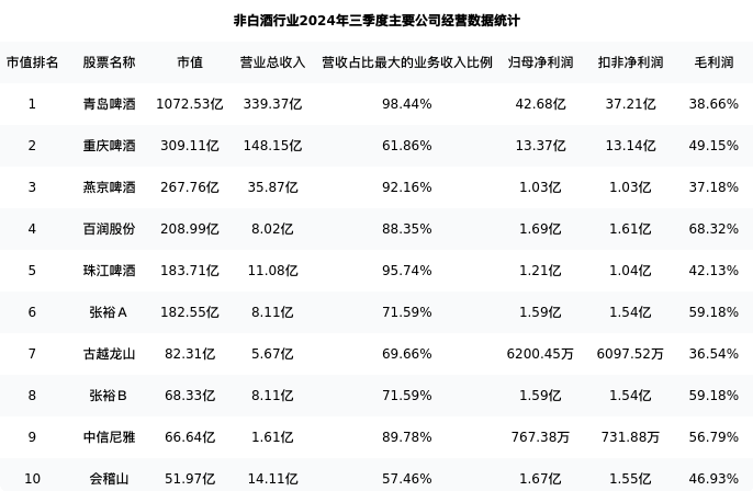 中信尼雅最新报告期数据为三季度,下表汇总了非白酒行业内市值靠前的公司三季度主要经营数据