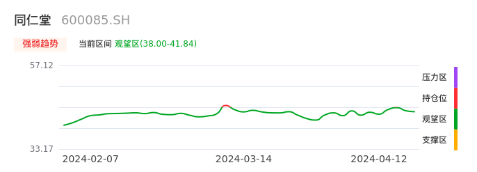 我们来看一下该股的九方特色指标强弱趋势的情况:同仁堂自03月13日从持仓区下穿到观望区,股价近期持续走弱。短期已经进入空头行情,且下跌动能仍未衰竭。建议继续谨慎观望。