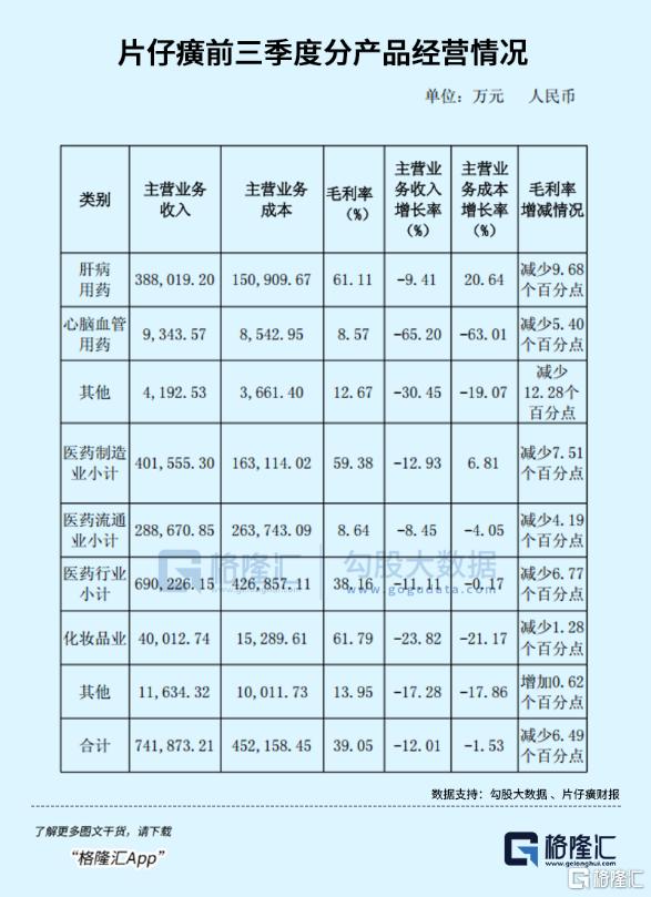 在营收的大幅下降背后,是片仔癀的核心产品肝病用药业务,也即是片仔癀系列产品,前三季度营收同比下滑9.41%至38.8亿元。