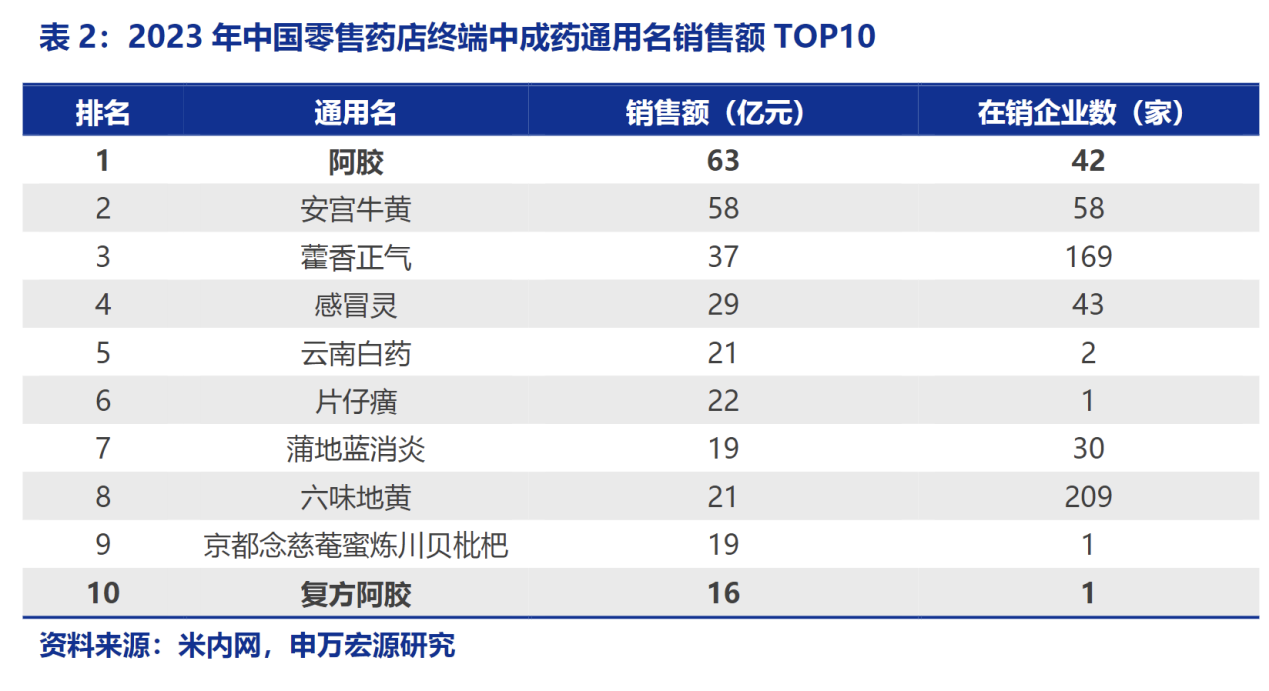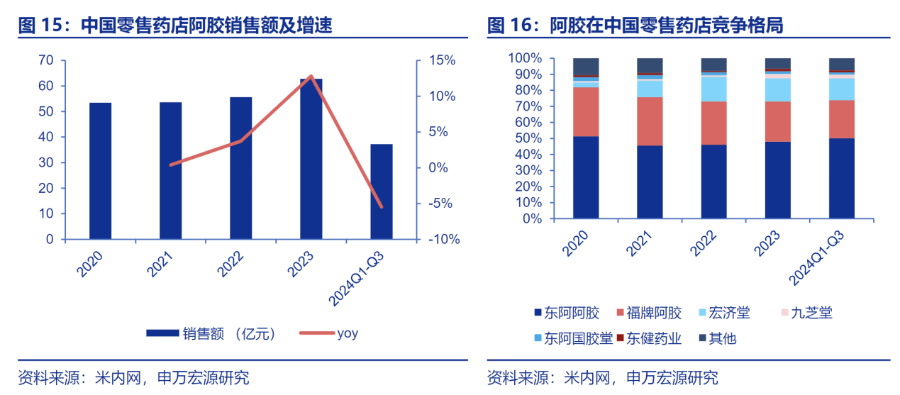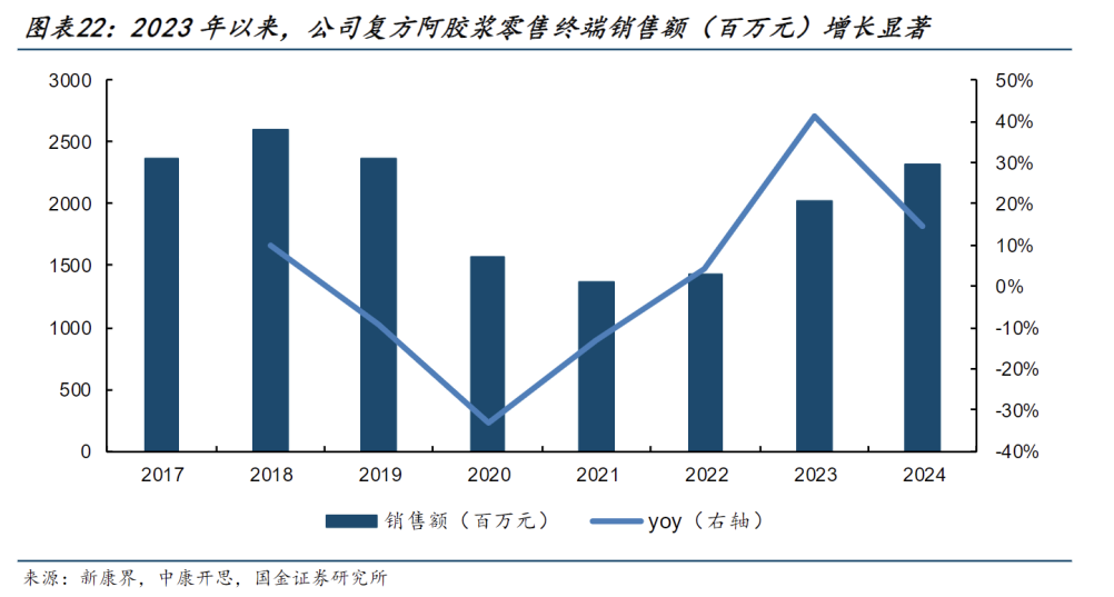 2017年以来国家医保目录开始动态调整,对于复方阿胶浆的医保支付标准趋于严格,限定支付范围“限有重度贫血检验证据”,复方阿胶浆销售趋缓;2022年复方阿胶浆列入多省医保改革试点名单,将医保支付范围扩展到说明书适应证,2023年新版医保目录中彻底取消“限有重度贫血检验证据”的限制。政策的调整推动复方阿胶浆在零售药店快速放量,根据米内网数据显示,2023年复方阿胶浆在中国城市药店销售额超16亿元,同比增速达58.1%,成为公司重要增长引擎。