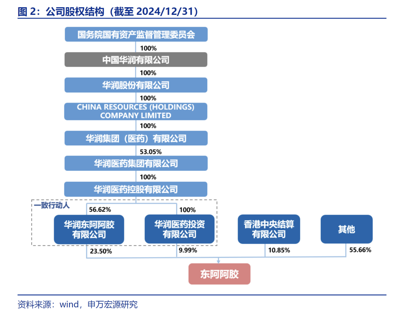 截至2024年底,公司第一大股东为华润东阿阿胶有限公司,持有公司23.50%的股份,与华润医药投资有限公司为一致行动人,合计持有公司股份33.49%。股权穿透后实控人为中国华润有限公司,背靠国务院国资委,股权结构稳定。