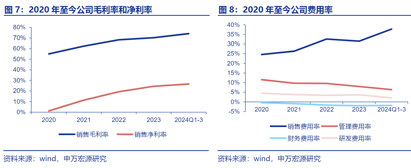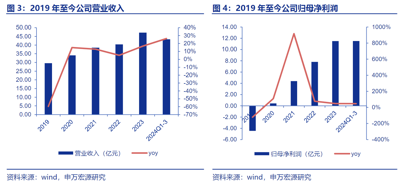 经过两年阵痛期,公司自2021年开始步入良性成长期,2021-2023年营业收入增长稳健,复合增长为10.7%,归母净利润持续高增,复合增长为61.7%。2024年前三季度公司实现营业收入43.29亿元,同比增长26.3%,实现归母净利润11.52亿元,同比增长47.0%,业绩表现亮眼。