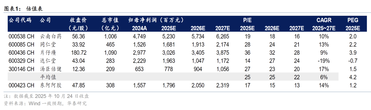 预计阿胶系列维持双位数增长:预计13Q25阿胶系列(阿胶块、阿胶浆、阿胶粉、阿胶糕)收入同比维持高速增长。看好公司发力线上渠道,随着消费复苏、医保支持、品类扩充,预计阿胶系列2025~2025年收入维持双位数增长。