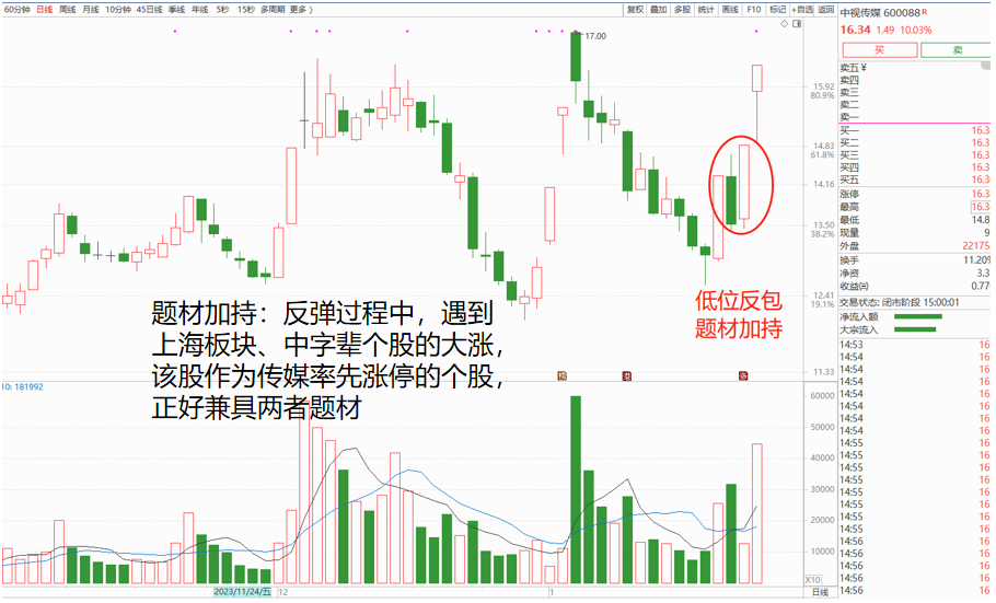 为什么能够反包上去?注意两个细节:第一,一定要低位,高位出现强反的可能性不高,且风险巨大;第二,要有题材加持,比如中视传媒第一次涨停,是基于AI传媒方向的炒作,而第二次涨停,择时基于反弹过程中,内在的上海基因、中字头基因发酵,成就了它后面的连板!