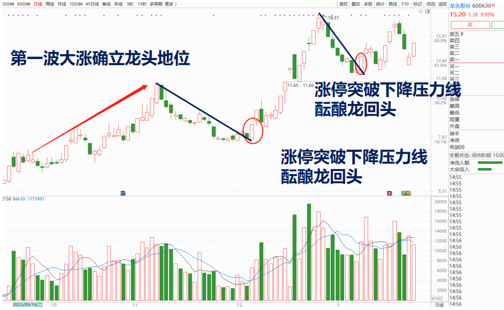 这个方法的注意点是,贴近市场主流,比如龙字辈二波,当时市场低迷期间,资金在传统板块进攻受阻,玄学成为抱团取暖的对象,龙头股份走出了非常经典的龙回头连板机会,我们来看。