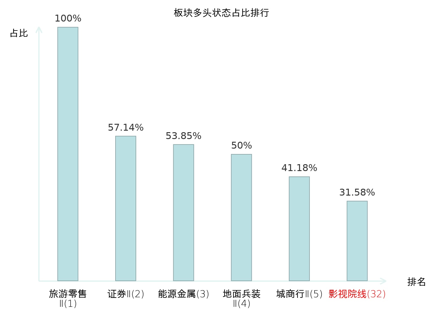 全市场所有行业板块中主力多头状态占比排名中,旅游零售Ⅱ板块位居第一。渔业板块名次提升最快,较昨日上升57位。