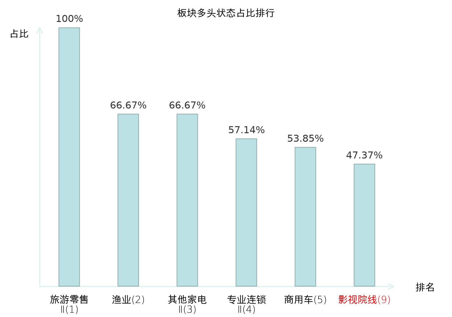 全市场所有行业板块中主力多头状态占比排名中,旅游零售Ⅱ板块位居第一。农产品加工板块名次提升最快,较昨日上升46位。