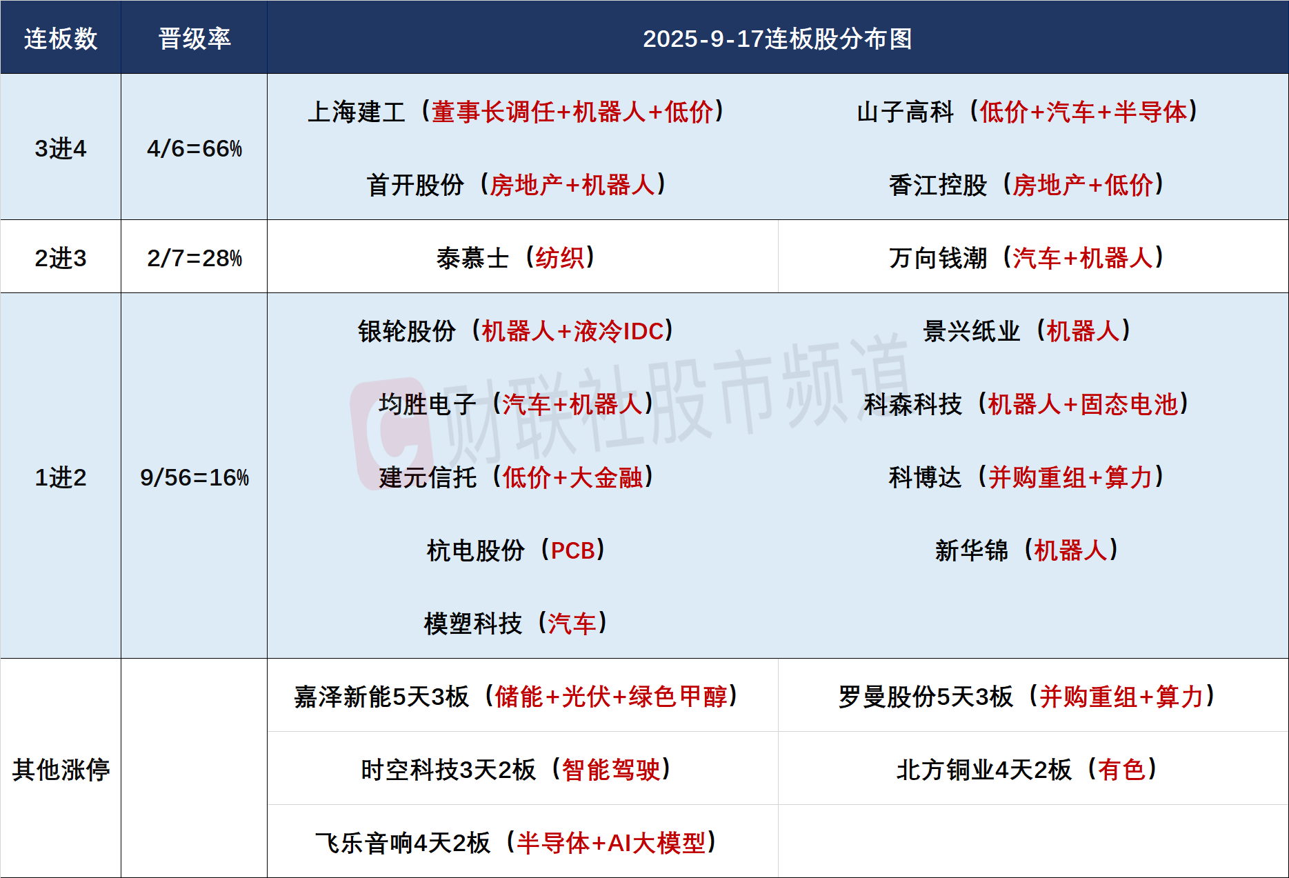 连板晋级率降至42.86%,此前走出10天9板的人气股首开股份并未受到可能停牌的公告拖累,仍强势晋级4连板,最近11个交易日累计上涨近1.8倍,进而对10厘米方向抱团股人气继续形成正面加强,上海建工、香江控股、山子高科三只低价人气股均实现晋级4连板,使得低价股板块今日仍有十余股录得涨停。可见首开股份仍是目前低价股以及10厘米方向抱团小票的人气风向标,若该股遭遇停牌,板块内其余连板股被动分歧后的走势或决定低价小票抱团情绪能否维系。