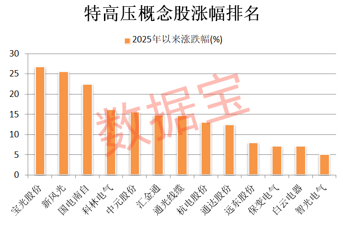 据统计,截至7月4日收盘,特高压概念股合计A股市值超7500亿元。2025年以来概念股平均上涨1.73%,5股累计涨幅超15%,分别是宝光股份、新风光、国电南自、科林电气、中元股份。