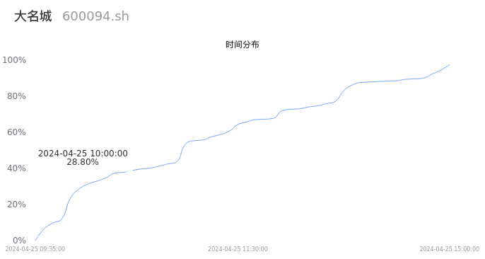 600094大名城2024年04月25日成交16.11万手,成交金额5737.20万元,相较昨日缩量6.77万手,换手率0.71%,成交清淡。