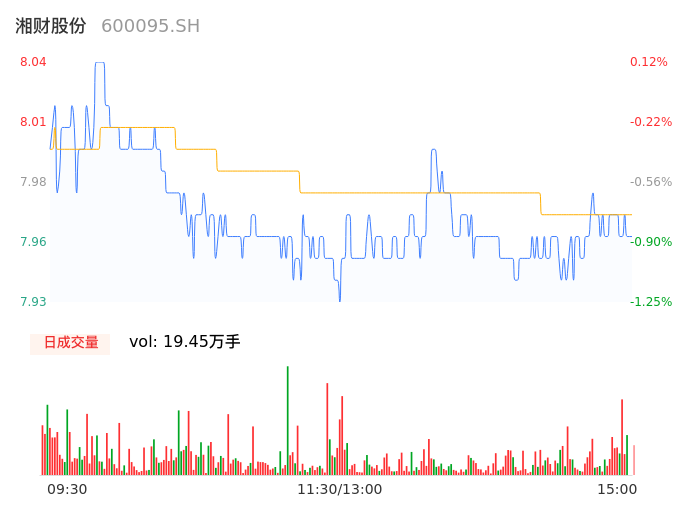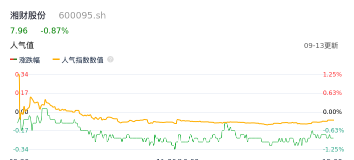 09月13日,湘财股份收报7.96,股价涨幅-0.87%,成交金额1.55亿元,换手率0.68%。